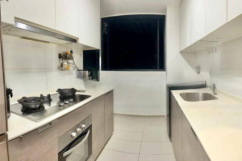 This well-maintained 3-bedroom, 2-bathroom condo features an open-concept layout that seamlessly connects the living and dining areas. The kitchen boasts wood-grain cabinetry and white quartz countertops, equipped with a gas hob and built-in oven for the culinary enthusiast. The master bedroom offers a built-in floor-to-ceiling wardrobe and an integrated vanity desk, ensuring both style and functionality. Modern finishes throughout, including designer lighting fixtures and a vertical green wall feature, elevate the living experience.