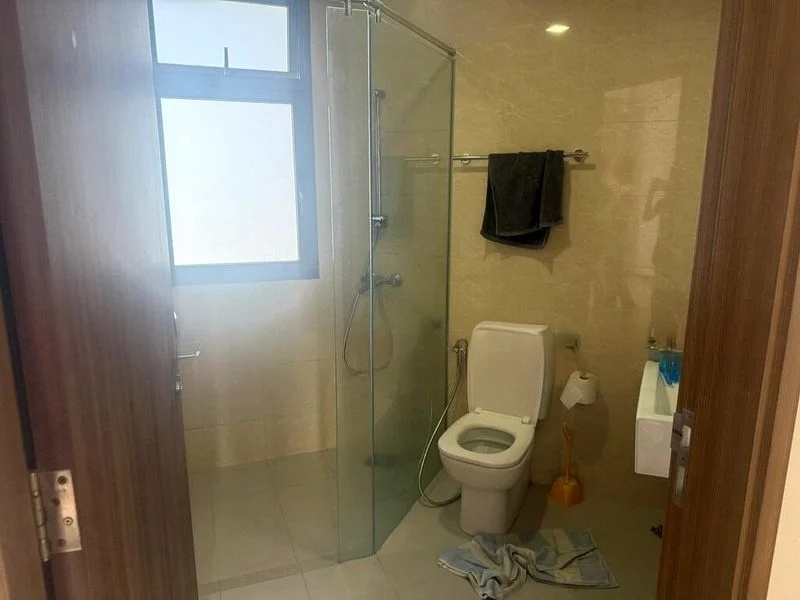 Step into a world of elegance as you enter this stunning 5-bedroom unit at Palm Isles. The bright and airy ambiance is accentuated by abundant natural light streaming through the floor-to-ceiling sliding glass doors, illuminating the exquisite marble flooring in the living area. With a modern false ceiling featuring cove lighting and a striking wooden feature wall, this space invites you to relax and unwind amidst views of lush greenery and neighboring buildings.