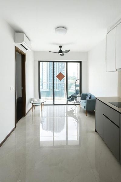Step into a warm and inviting space where abundant natural light floods through floor-to-ceiling windows, illuminating the stylish finishes and cozy ambiance. The living room, adorned with a plush round rug, seamlessly connects to a balcony that offers an unblocked view of lush greenery, creating a serene retreat right at home.