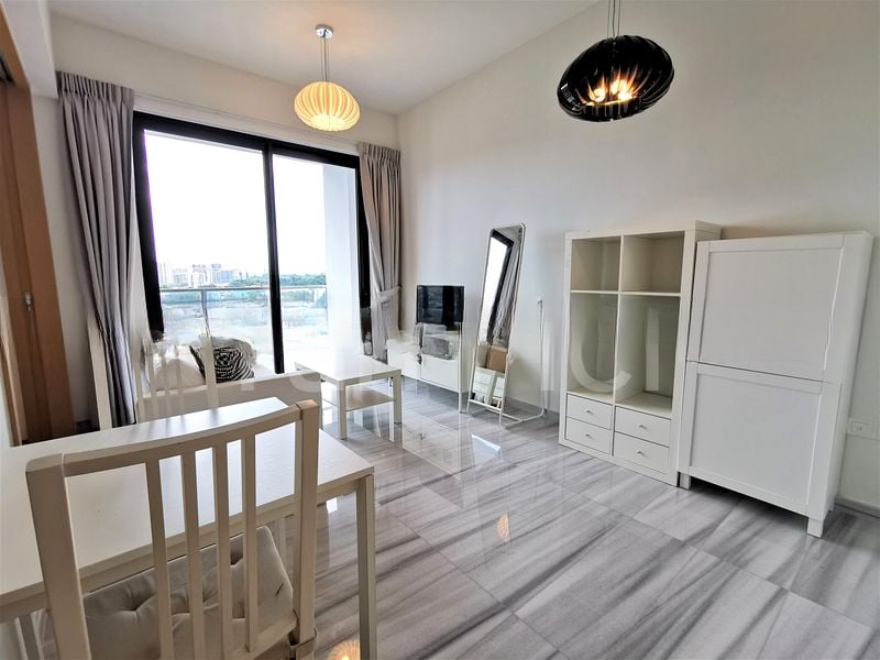 Step into a world of modern elegance with abundant natural light flooding through floor-to-ceiling windows, offering breathtaking views of the city skyline and lush greenery. The open-concept living room features exquisite marble-look tiled flooring and a seamless flow to the balcony, creating an inviting ambiance perfect for relaxation or entertaining.