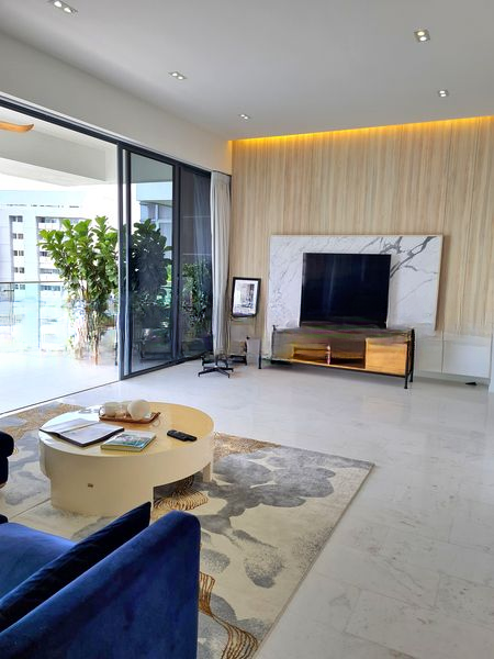 Step into a world of artistic elegance as you enter this stunning unit at The Trizon. Bathed in natural light, the high ceilings and floor-to-ceiling windows create an airy ambiance, while the eclectic decor and designer textured walls invite creativity and inspiration. Enjoy breathtaking views of the city skyline and lush greenery from your private terrace garden, perfect for relaxation or entertaining.