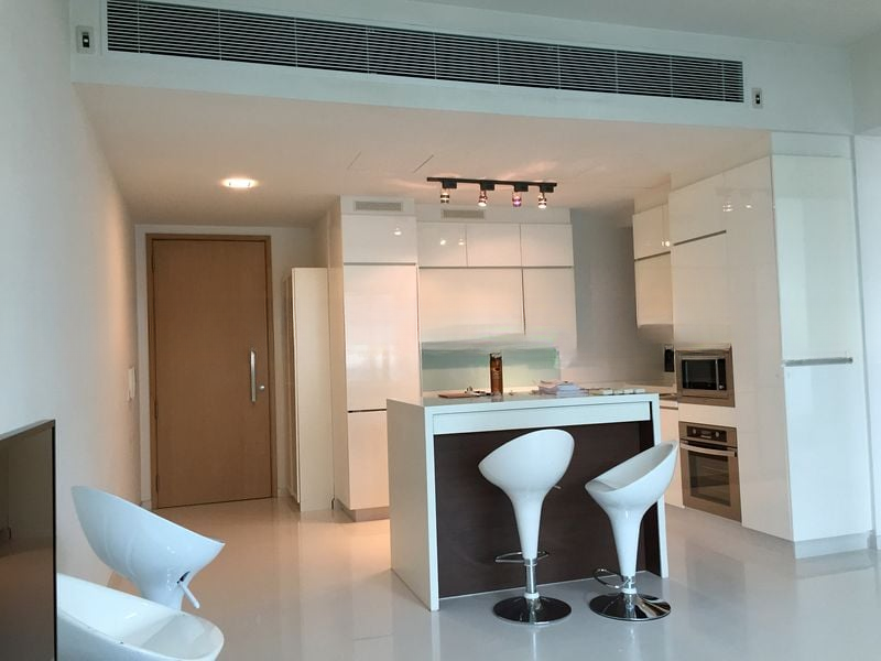 This thoughtfully designed layout features a spacious master bedroom with an open wardrobe, a cozy second bedroom perfect for a study, and two well-appointed bathrooms with stylish mirrored cabinets and glass shower partitions. The kitchen boasts white cabinetry with built-in appliances, including an oven and induction hob, alongside a breakfast bar that invites casual dining.