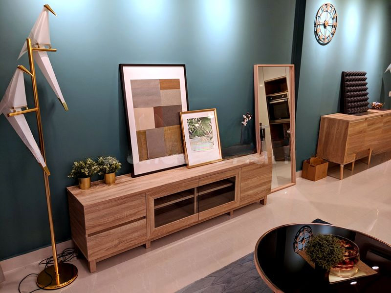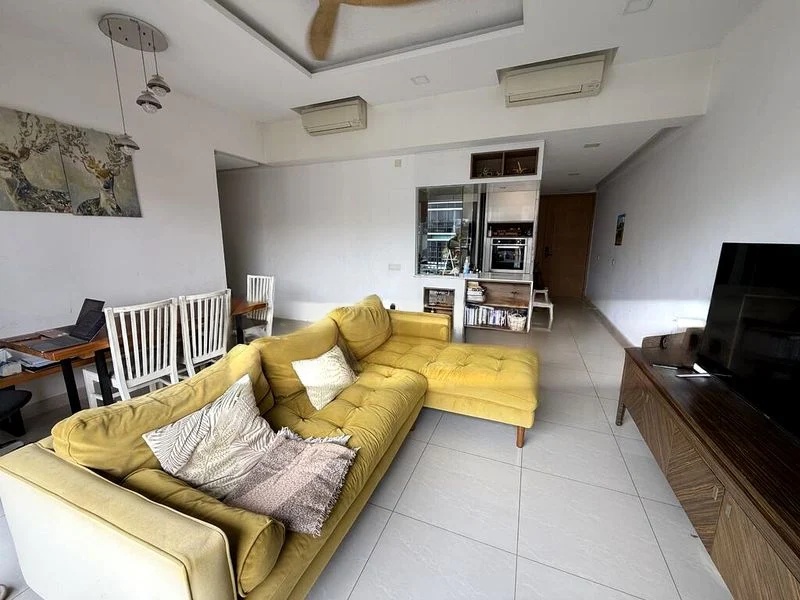 Step into a beautifully renovated unit at COCO PALMS, where abundant natural light fills the open-concept living space, creating a warm and inviting atmosphere. The modern finishes, including a stylish breakfast bar and an L-shaped yellow sofa, offer a perfect blend of comfort and elegance, while the balcony with wood decking provides a serene spot to unwind amidst the urban landscape.
