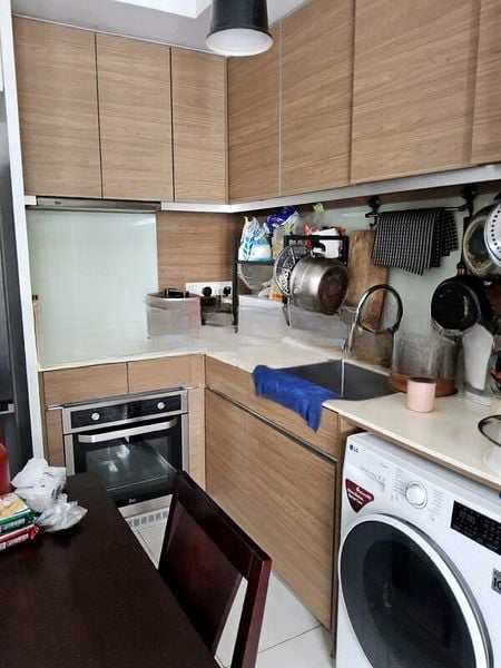 This well-maintained 3-bedroom, 2-bathroom unit boasts a thoughtfully designed layout, featuring a fully-equipped kitchen with wooden cabinetry and integrated appliances, a cozy living area with tiled flooring, and a spacious bedroom complete with a study desk and ceiling fan. The utility room adds practicality with a washing machine and ample storage, ensuring every detail caters to modern living.