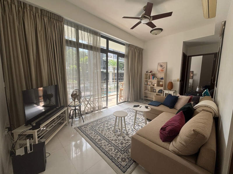 Step into a bright and airy sanctuary where abundant natural light floods through floor-to-ceiling windows, offering stunning views of the pool and lush greenery. The spacious balcony invites you to unwind while enjoying alfresco dining, creating a perfect blend of indoor and outdoor living.