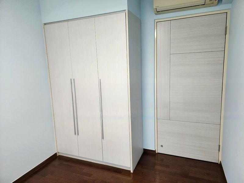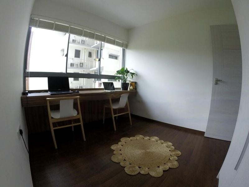 Step into a world of modern elegance as you enter this beautifully renovated HDB flat at 138B Yuan Ching Rd. The minimalist design is accentuated by natural light filtering through venetian blinds, creating a warm ambiance. The built-in floor-to-ceiling wardrobe and integrated long wooden study desk add both functionality and style, making the space feel open and inviting.