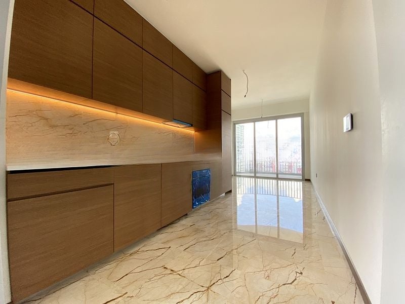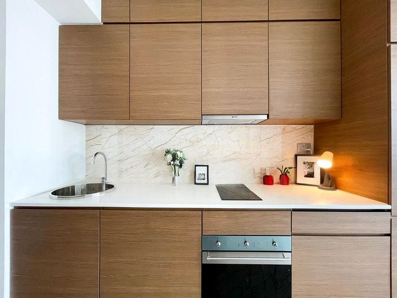 This efficient 88 sqm (947 sq ft) layout features a private lift entrance, a spacious living room with a wall-mounted TV, and a galley kitchen equipped with modern wood-grain cabinetry, white countertops, and high-end appliances. The master bedroom boasts built-in sliding wardrobes and air conditioning, while the bathrooms are adorned with elegant marble-look tiles and a refreshing rain shower, ensuring comfort and style throughout.