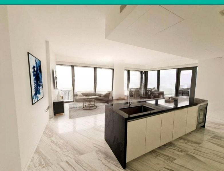 Step into a realm of modern luxury as you enter this meticulously designed unit at Wallich Residence. The abundant natural light floods through floor-to-ceiling glass walls, illuminating the elegant black marble dining table and the sleek island kitchen with its striking black countertops. The ambiance is both sophisticated and inviting, enhanced by breathtaking views of the city skyline, port, and sea.