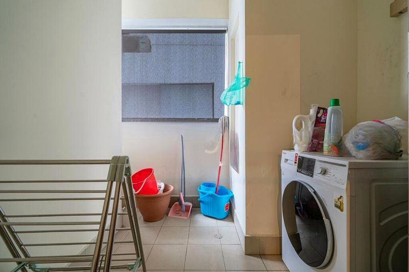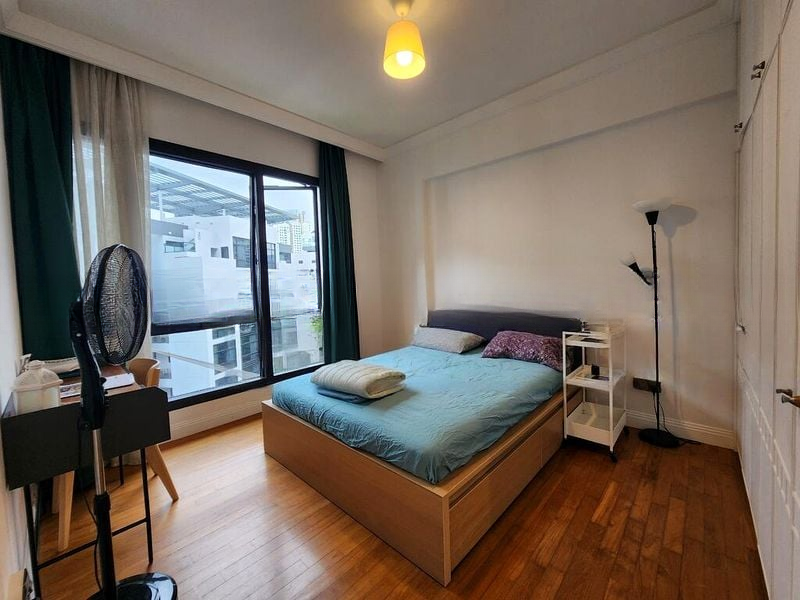 This thoughtfully designed unit features marble-clad bathrooms with walk-in showers and a stylish black marble vanity top, adding a touch of elegance. The bedrooms are equipped with built-in wooden wardrobes and a striking red accent dresser that adds character to the space. Enjoy the comfort of a fully-furnished home with a layout that maximizes both space and functionality.