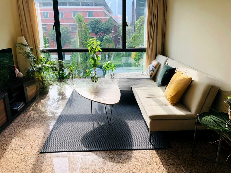 Step into a warm and inviting space where natural light filters through large windows, highlighting the cozy ambiance of this well-maintained 2-bedroom unit at River Place. The spacious balcony beckons with an octagonal wooden dining set, perfect for al fresco meals while overlooking lush greenery and residential views.
