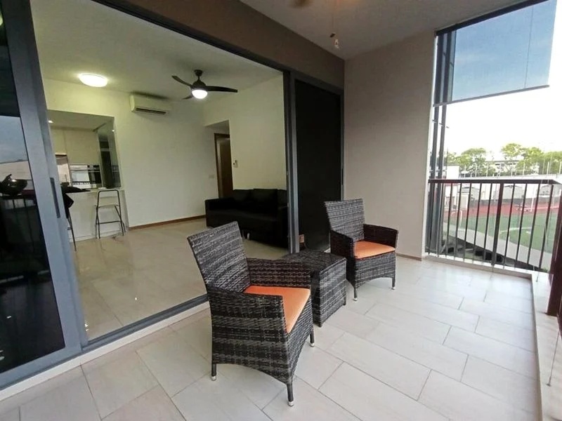 Step into a bright and airy oasis at Lakeville, where abundant natural light floods the spacious living area through full-height glass sliding doors. The modern finishes, including large format floor tiles and a chic kitchen island with a breakfast bar, create an inviting ambiance that feels both luxurious and comfortable. Enjoy unblocked views of the sports field and lush greenery from your expansive balcony, perfect for relaxation or entertaining.
