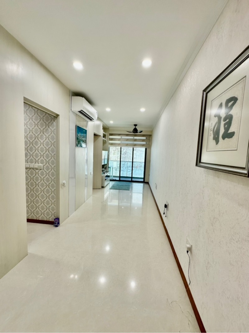 This 2-bedroom condo features a thoughtfully designed layout, showcasing standout elements such as a sleek kitchen equipped with an integrated oven, black glass upper cabinets, and a striking glass backsplash. The living room boasts a wall-mounted TV and a minimalist console, perfect for entertaining. The study/bedroom offers a cozy workspace with a built-in desk and wardrobe, ensuring both comfort and practicality.
