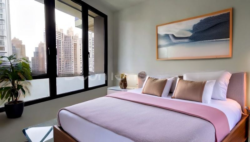 This thoughtfully designed 1-bedroom condo features an open-concept kitchen with striking black marble countertops and an integrated Miele oven, perfect for culinary enthusiasts. The living room flows seamlessly to a balcony with glass railings, offering panoramic views that make for an ideal relaxation spot. The bedroom boasts a built-in sliding wardrobe with a sleek metallic finish, while the bathroom is a sanctuary with dark stone tiles and a rain shower, ensuring a spa-like experience at home.