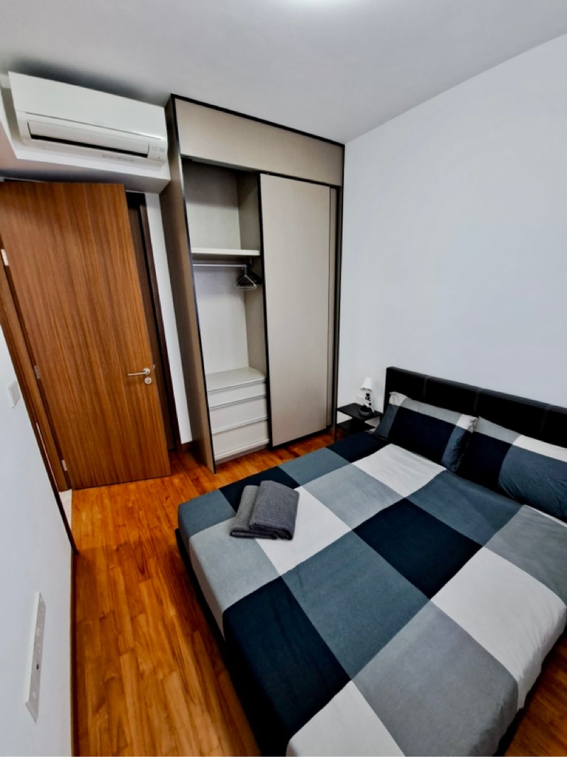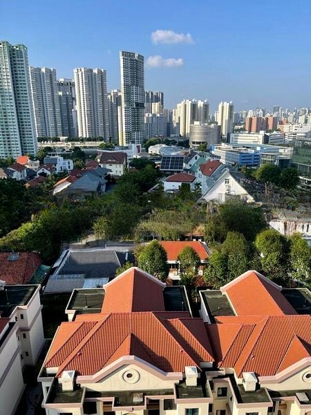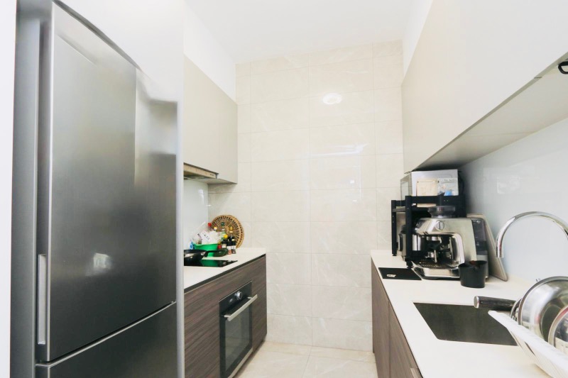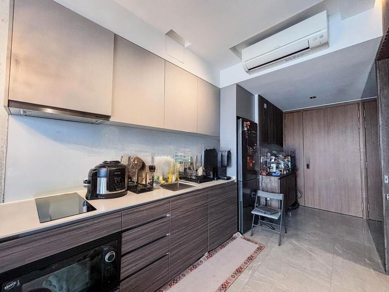This well-maintained 1-bedroom unit features a stylish bathroom adorned with grey marble wall cladding, a rain shower, and a wall-hung toilet for a contemporary touch. The open layout seamlessly connects the living space to the balcony, where you can unwind while soaking in the unblocked views over landed estates. The large swimming pool with integrated fountains and a modern glass-walled pavilion enhance the outdoor experience, making it perfect for relaxation or entertaining.