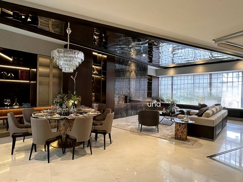 Step into a realm of modern luxury at this exquisite unit in St Regis Residences Singapore. The grand entrance lobby welcomes you with a stunning designer chandelier, complemented by a mirrored feature wall and elegant marble flooring adorned with black geometric inlays. Abundant natural light pours through the floor-to-ceiling windows, creating a warm and inviting ambiance throughout the space.