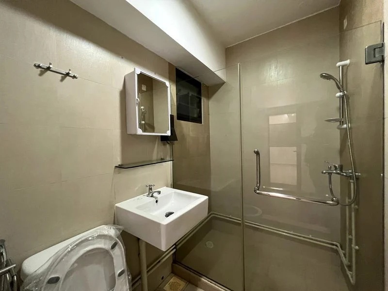 This unit features three comfortable bedrooms, each equipped with air-conditioning for your comfort. The master bedroom boasts a large wooden wardrobe, while the additional rooms come with built-in desks and shelving units, catering to both relaxation and productivity. The bathroom is thoughtfully designed with two-tone wall tiles and a wall-mounted water heater, adding to the overall convenience.