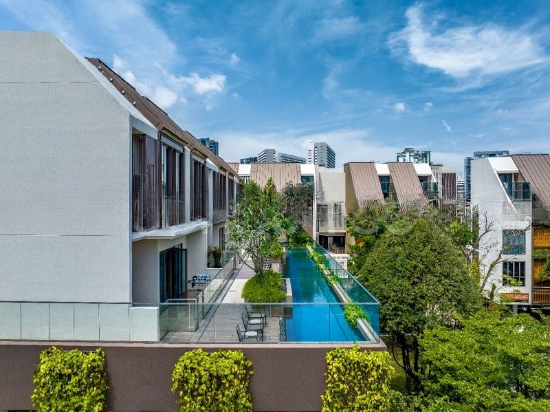This thoughtfully designed 1-bedroom unit features an open-concept living area with built-in storage cabinets, seamlessly connecting to a compact kitchen adorned with wood-grain cabinets and grey countertops. The balcony, equipped with a laser-cut decorative screen and glass railing, offers a perfect spot to unwind while enjoying the tranquil pool view. With a modern architectural facade and a communal lap pool, this residence epitomizes contemporary living.