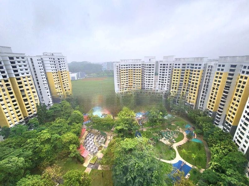Step into a warm and inviting atmosphere where modern comfort meets cozy living. This well-maintained 3-bedroom flat at 486 Admiralty Link boasts a full renovation that highlights its wooden flooring and a spacious living room featuring a large TV console and a leather recliner sofa. Natural light filters through large windows, creating a serene ambiance complemented by views of lush greenery and the nearby urban park.