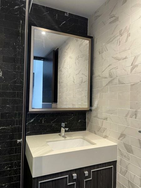 Step into a world of modern elegance as you enter this beautifully renovated 1-bedroom unit at Mayfair Gardens. The abundant natural light floods the space, highlighting the high ceilings and the stunning marble-patterned wall tiles. Large sliding glass doors open to a balcony that offers unobstructed views of lush greenery, creating a serene ambiance that invites relaxation.