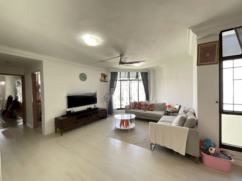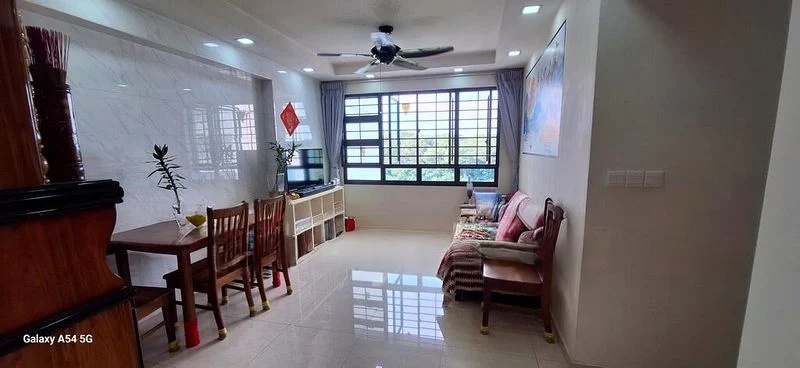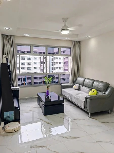 Step into a sanctuary of modern elegance at this well-maintained HDB flat on Segar Rd. The abundant natural light floods through large windows, accentuating the sleek finishes and creating a bright, inviting ambiance. Enjoy the seamless integration of contemporary design with features like an integrated TV console lighting and a stylish marble-look coffee table, all framed by views of lush greenery and neighboring buildings.