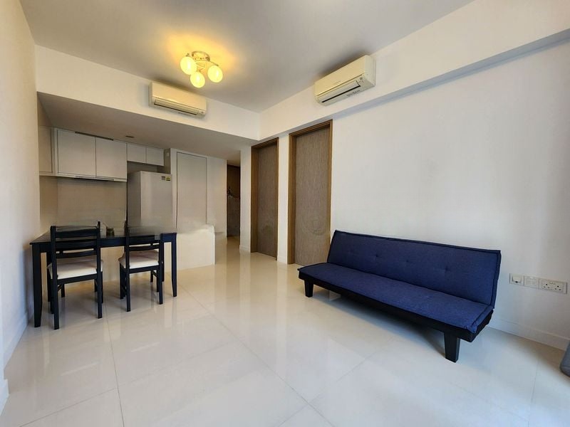This well-maintained unit features a seamless layout with a galley kitchen boasting white cabinetry and a glass partition wall, ensuring a contemporary feel. Enjoy meals in the integrated dining area, or step out onto the balcony for al fresco dining with a view. The master bedroom offers a private retreat with built-in storage under the bed, while the playroom is perfect for family activities, bathed in natural light. Modern bathroom fixtures and a glass shower enclosure enhance the luxurious experience.