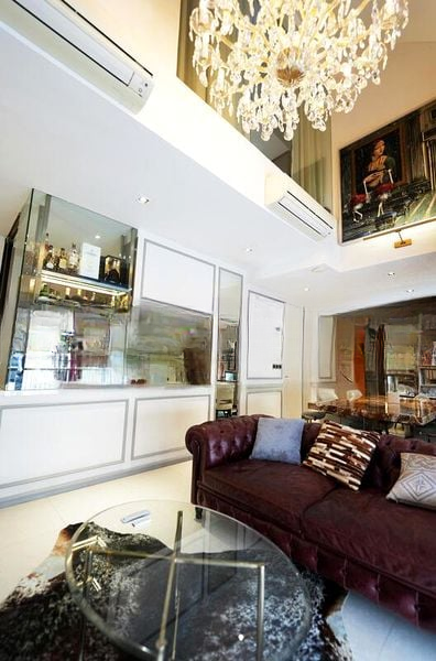 Step into a world of sophistication and elegance as you enter this beautifully designed unit at The Creek @ Bukit. The abundant natural light floods the space, highlighting the double-volume high ceiling and the grand crystal chandelier that serves as a stunning focal point. The living room, adorned with a leather chesterfield sofa and a cowhide rug, invites you to relax while enjoying the urban cityscape views from the balcony, complete with artificial turf and outdoor lounge seating.