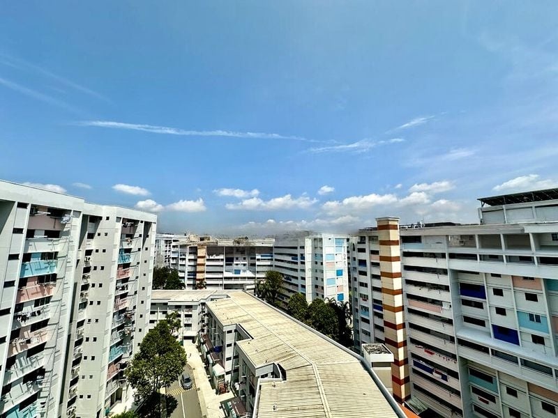 Step into this well-maintained 3-bedroom flat and be greeted by a functional and clean ambiance, accentuated by moderate natural light filtering through the open layout. The spacious living area, adorned with a sleek black leather sofa, seamlessly flows into the dining space featuring an elegant marble-look dining table, perfect for family gatherings. Enjoy views of the neighboring HDB blocks, creating a vibrant urban backdrop.