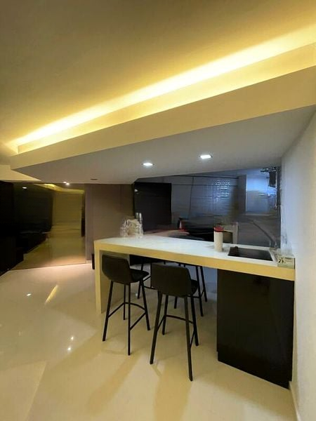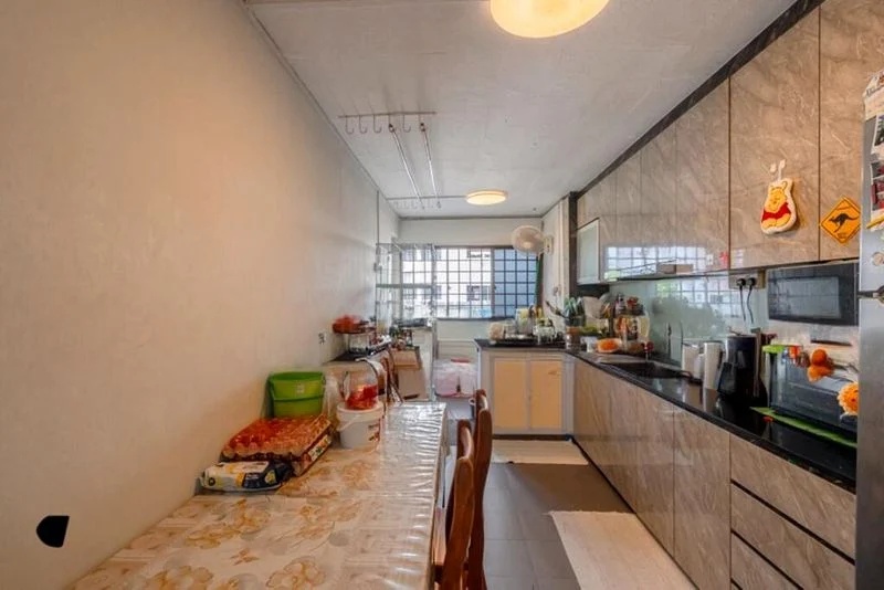 Step into this well-maintained 3-room flat and be greeted by a functional yet modern ambiance. The living room, illuminated by recessed ceiling lights, features a long wicker sofa and dark floral curtains that add a touch of elegance. The decorative floor tile runner leads you to the galley kitchen, where white cabinetry paired with striking black countertops creates a chic cooking space, complemented by built-in appliances and pendant lighting.