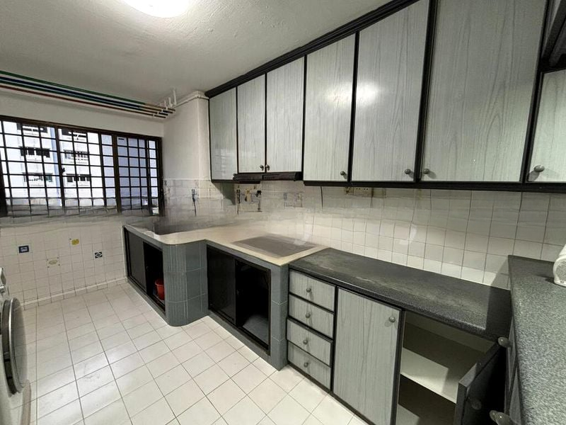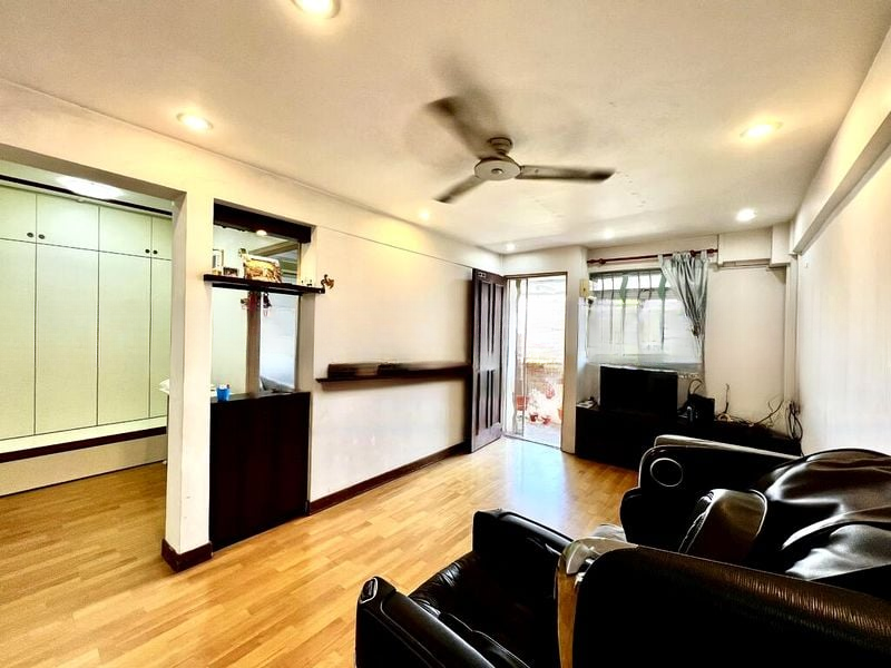 Step into a welcoming space that exudes a lived-in charm, where moderate natural light filters through window grilles, illuminating the functional layout. The views of lush greenery and neighboring HDB blocks create a serene backdrop, complemented by the nearby landscaped park and basketball court, inviting an active lifestyle.