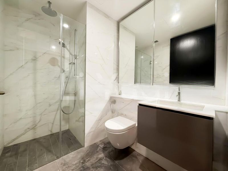 Step into this beautifully designed unit at Midtown Bay, where abundant natural light floods the open-concept living and dining area, highlighting the sleek marble-look floor tiles and the stunning city skyline views through floor-to-ceiling windows. The modern minimalist ambiance invites you to unwind in a space that feels both luxurious and welcoming.