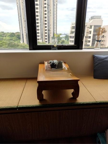 This compact 2-bedroom, 2-bathroom layout features an en-suite master bedroom complete with a luxurious bathtub, alongside a common bathroom for convenience. The modern white kitchen boasts high-gloss cabinetry and an induction cooktop, while the tatami-style window seating in the living area offers a unique touch, perfect for relaxation. A built-in study desk by the window allows for productivity with panoramic views, making this unit both functional and aesthetically pleasing.