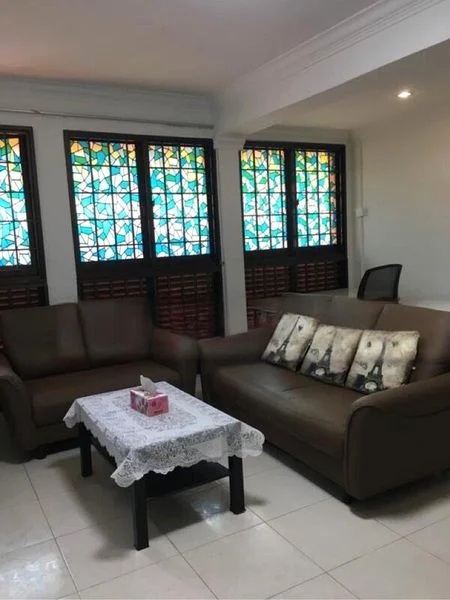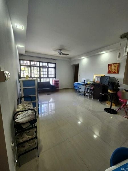 Step into this well-maintained HDB unit and feel the warmth of a functional and simple ambiance. The natural light filters through large windows adorned with security grilles, creating a welcoming atmosphere. The spacious galley kitchen, featuring light blue cabinetry and a curved breakfast counter, invites you to explore your culinary skills while enjoying the comfort of home.