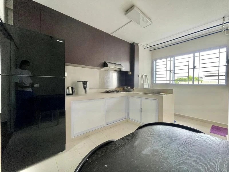 Step into this beautifully renovated 3-bedroom flat and be greeted by an abundance of natural light that fills the open-concept living and dining area. The bright ambiance is enhanced by cove lighting and stylish wall decals, while the terrazzo-style flooring adds a touch of elegance. The standout purple accent wall in the bedroom creates a cozy yet modern retreat, complemented by a spacious L-shaped built-in wardrobe.