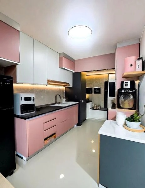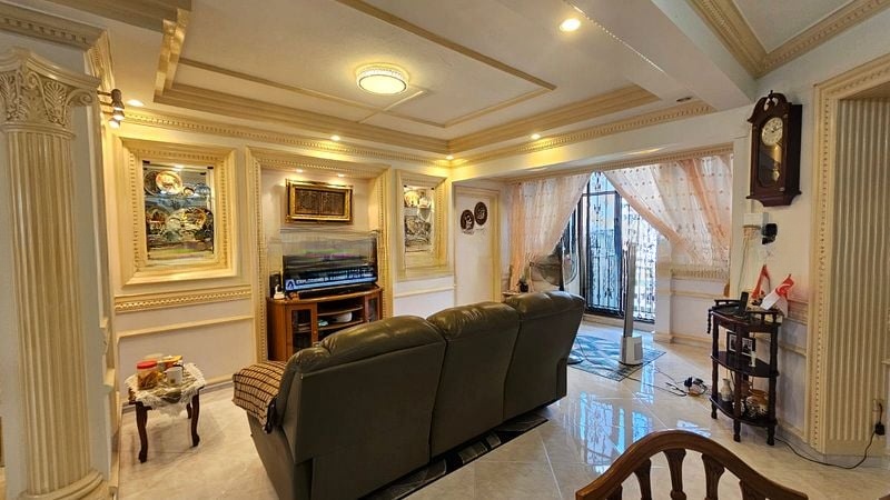 Step into a world of elegance as you enter this beautifully renovated HDB flat at 236 Compassvale Walk. The ornate recessed ceiling with gold trim and decorative classical columns create an inviting ambiance, while the moderate natural light enhances the warmth of the wood-look flooring. The living room, adorned with exquisite moldings and recessed lighting, offers a perfect setting for relaxation and entertainment.