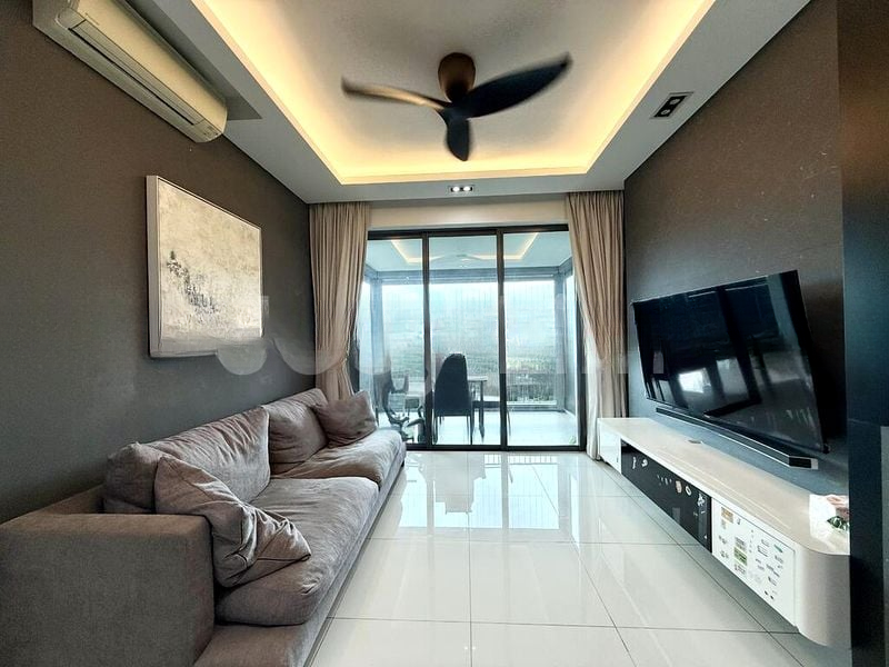 Step into a world of modern elegance as you enter this beautifully renovated 4-bedroom unit at The Topiary. The abundant natural light floods the living space, highlighting the designer finishes, including a stunning mirrored feature wall and a designer chandelier that sets a cozy yet sophisticated ambiance. The spacious balcony, adorned with patterned floor tiles and globe pendant lights, invites you to unwind while enjoying serene views of lush greenery.