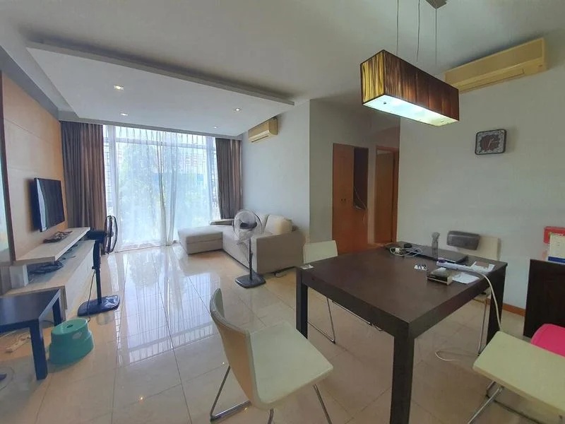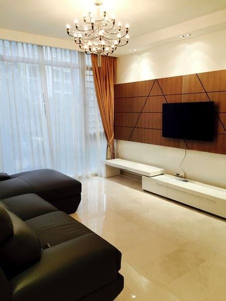 Step into a world of modern elegance as you enter this beautifully renovated 4-bedroom unit at The Lakeshore. The abundant natural light floods through large windows, highlighting the stunning wooden feature wall and designer chandelier in the living room. The cozy ambiance is complemented by sheer curtains that frame picturesque views of lush greenery, creating a serene retreat right at home.