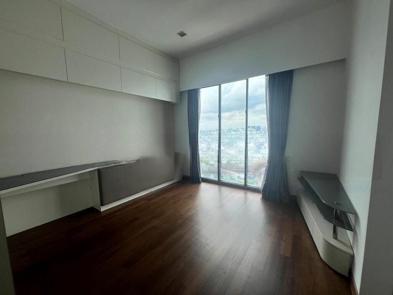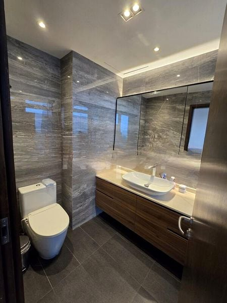 This well-maintained 2-bedroom unit features a spacious living room with tiled flooring and direct balcony access, perfect for entertaining. The dining area boasts a striking mirrored wall that enhances the sense of space, complemented by a stylish glass dining table. Each room is thoughtfully designed, ensuring comfort and functionality, while the bathroom features modern sanitary ware with a chic touch of half-height dark tiles.