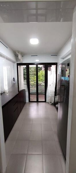 Step into a haven of modern minimalist design at this beautifully renovated HDB flat. The moment you enter, you are greeted by a spacious living area adorned with a striking dark wood feature wall and ceiling, complemented by light wood flooring that enhances the natural light filtering through large windows. The ambiance is both inviting and sophisticated, making it the perfect backdrop for relaxation or entertaining.