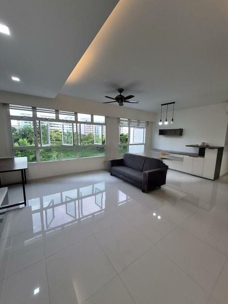 Step into this beautifully renovated 3-bedroom flat and feel the bright and airy ambiance envelop you. The open-concept living room greets you with its cove lighting and spacious layout, complemented by a large ceiling fan that enhances the airy feel. Enjoy urban views through the glass sliding doors in the galley kitchen, which features sleek white cabinetry and solid surface countertops, perfect for culinary enthusiasts.