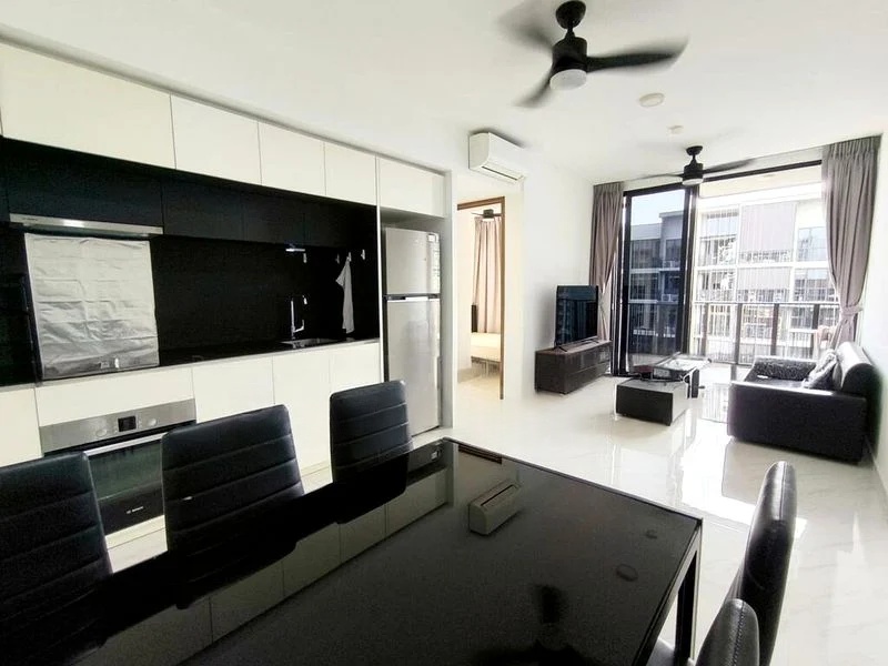 Step into this well-maintained 2-bedroom unit at LE QUEST and be greeted by a harmonious blend of modern aesthetics and functional design. The large windows invite natural light, illuminating the light wood flooring and offering serene views of the lush greenery and extensive lap pool. The ambiance is both inviting and refreshing, perfect for unwinding after a long day.