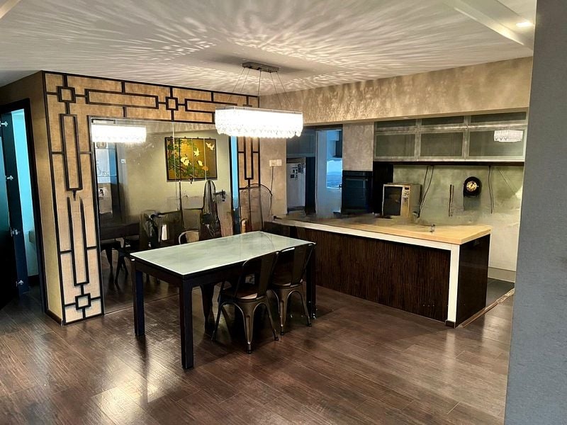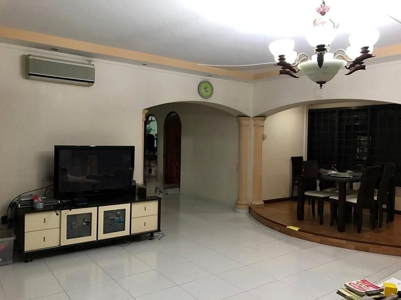 Step into this well-maintained HDB flat and feel the warmth of home envelop you. The inviting living room features white tiled flooring and arched entryways, creating a seamless flow into the dining area, where a raised wooden platform and decorative classical columns add a touch of sophistication. Natural light filters through large windows, enhancing the functional ambiance of this lived-in space.