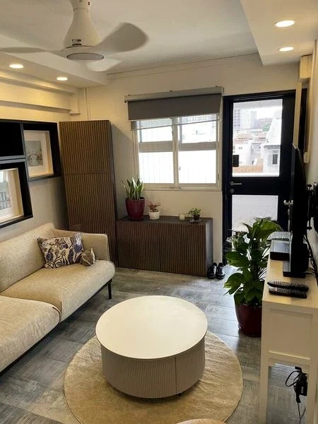 Step into a bright and airy space where abundant natural light floods through large windows, highlighting the unique curved architecture and distinctive red cylindrical pillars that define this charming HDB flat. The inviting ambiance creates a warm and welcoming atmosphere, perfect for relaxation and entertaining.