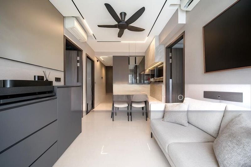 This well-maintained 2-bedroom unit boasts standout features such as a wood-slat feature wall with integrated lighting, a built-in storage bed, and a sleek kitchen equipped with an integrated oven and stainless steel refrigerator. The bathroom is a sanctuary with a rain shower and elegant grey stone-look tiles, while the living room is enhanced by recessed LED strip lighting and a ceiling fan for comfort.