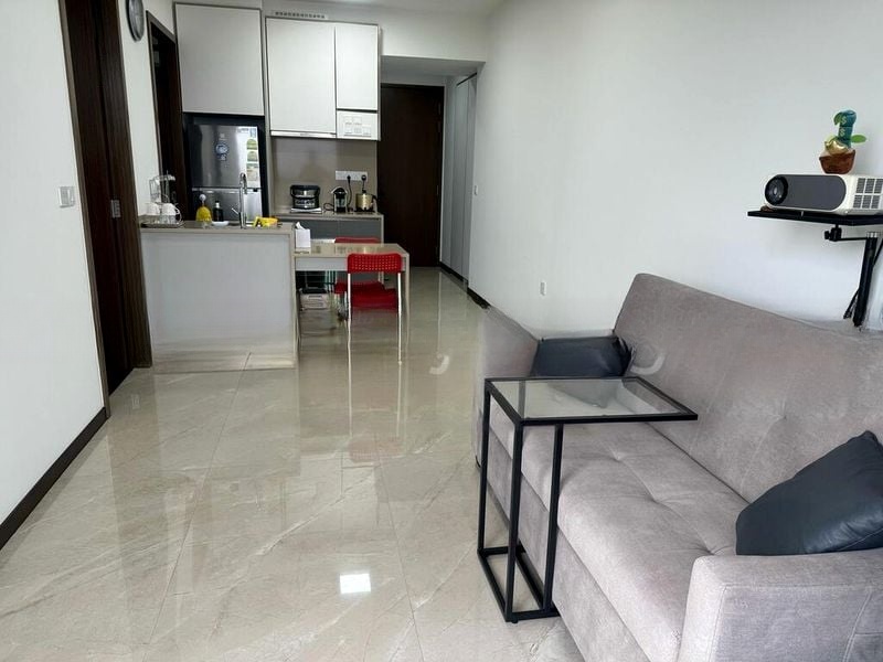 Step into this beautifully maintained 1-bedroom unit at Normanton Park, where abundant natural light floods the open-concept living space, accentuating the polished marble-effect tiles and modern minimalist design. The seamless flow from the living room to the balcony, framed by glass railings, invites you to enjoy breathtaking views of lush greenery and the city skyline.