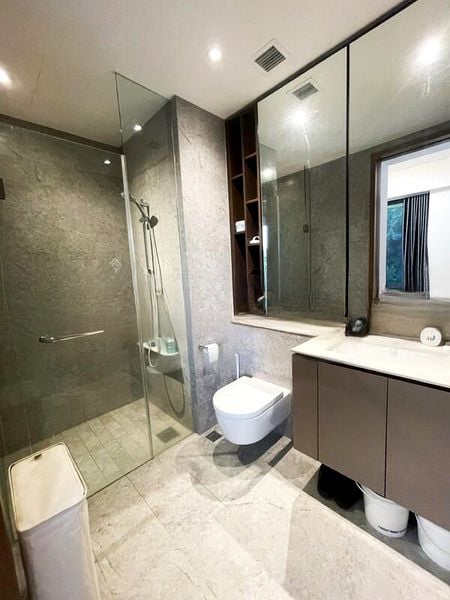 This well-maintained unit features a modern kitchen equipped with an induction hob and built-in oven, complemented by elegant marble-patterned backsplashes and wood-look cabinetry. Both bedrooms boast wood flooring and built-in wardrobes, ensuring ample storage while maintaining a sleek aesthetic. The bathroom is a contemporary haven with grey stone-look tiles and a glass shower partition, providing a touch of luxury to your daily routine.