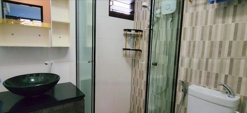 This well-maintained flat features a functional L-shaped kitchen with striking black countertops, perfect for culinary enthusiasts. The master bedroom boasts a built-in floor-to-ceiling wardrobe and wooden flooring, providing ample storage and comfort. Each room is thoughtfully designed, including a versatile study area and a bathroom equipped with a rain shower and instant water heater, ensuring both style and practicality.