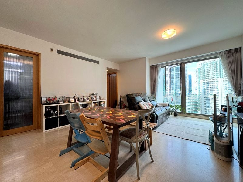 Step into a bright and airy sanctuary at Amaryllis Ville, where polished marble flooring and designer pendant lights create an inviting ambiance. The open-concept living and dining area, complemented by a large wall-mounted mirror, enhances the sense of space and light, while urban views provide a vibrant backdrop to your daily life.