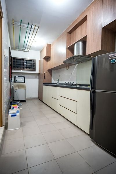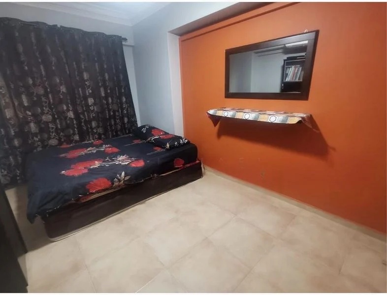 This well-maintained 2-bedroom flat features an L-shaped living room adorned with coved ceilings and tiled flooring, perfect for relaxation. The kitchen boasts monochrome cabinetry and white countertops, complemented by a stainless steel refrigerator and integrated cooker hood. Each bedroom is thoughtfully designed with large windows and air conditioning, ensuring a restful retreat.