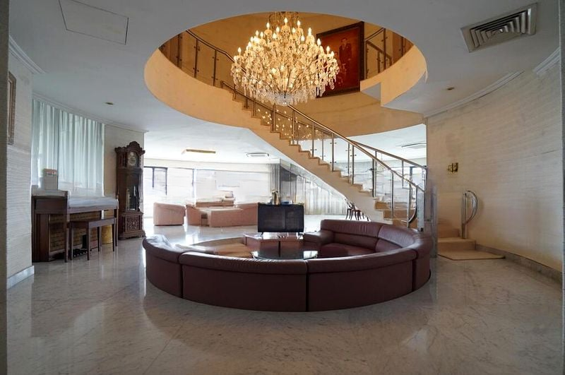 This spacious 5-bedroom, 7-bathroom unit boasts a unique layout featuring a sunken circular seating area and a grand curved staircase that adds to its charm. The living room, adorned with floor-to-ceiling windows and a mirrored feature wall, offers a perfect space for entertaining. The kitchen, with its mint green cabinetry and integrated oven, provides ample space for culinary adventures, while the curved balcony invites you to unwind amidst the urban landscape.
