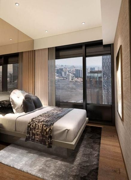 Step into a brand-new sanctuary where abundant natural light floods the space, accentuating the modern minimalist design. The floor-to-ceiling glass doors invite you to enjoy urban views, while warm wood flooring in the bedroom adds a touch of comfort and elegance.